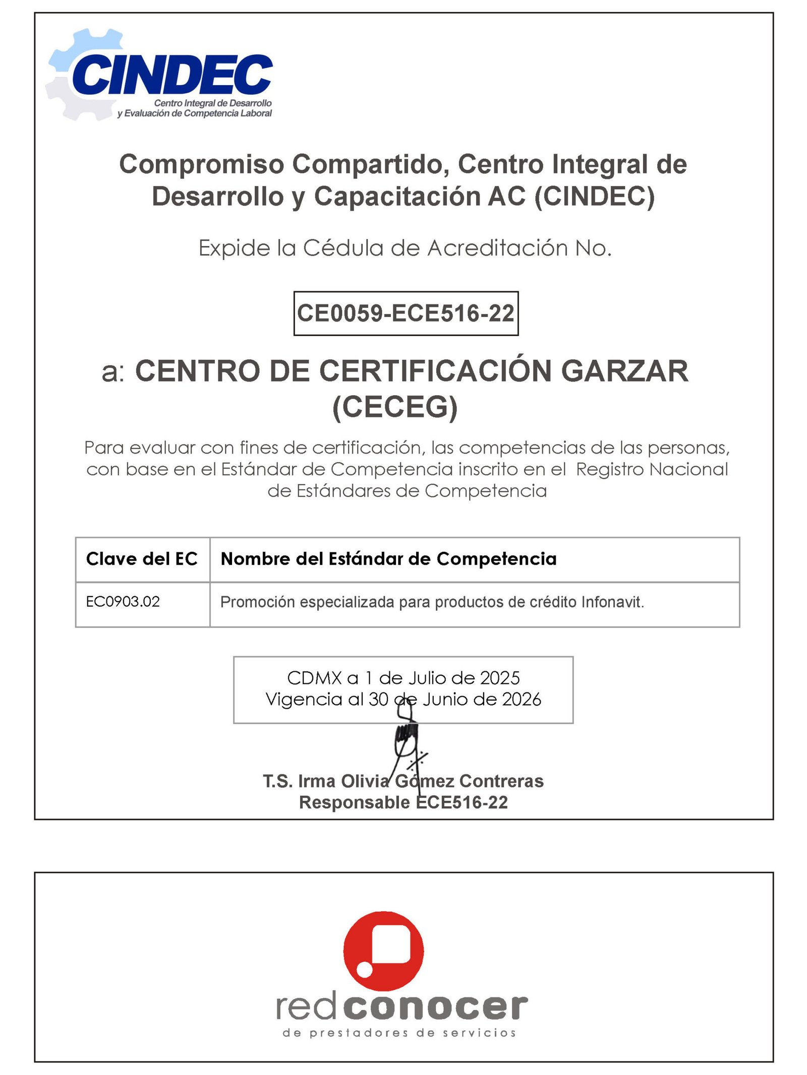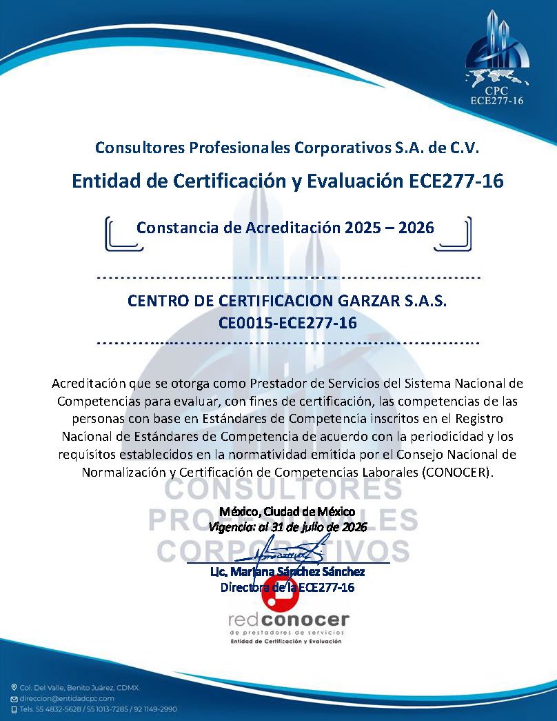 Somos un centro evaluador a nivel nacional acreditado por la RED CONOCER con número CE0015-ECE277-16, para evaluar y certificar competencias laborales con base en Estándares de Competencia (EC) inscritos en el Registro Nacional de Estándares de Competencia (RENAC).